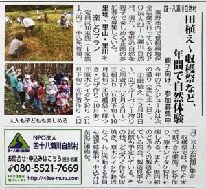 四十八瀬川自然村では、里山体験の参加希望者と支援に協力してくださる会員を募集しています。6月の田植えからする「どぶろく造り」をはじめ、薪・炭作り、ブルーベリーや椎茸栽培、花畑つくりなどを通して里山保全を行います。5月31 […]